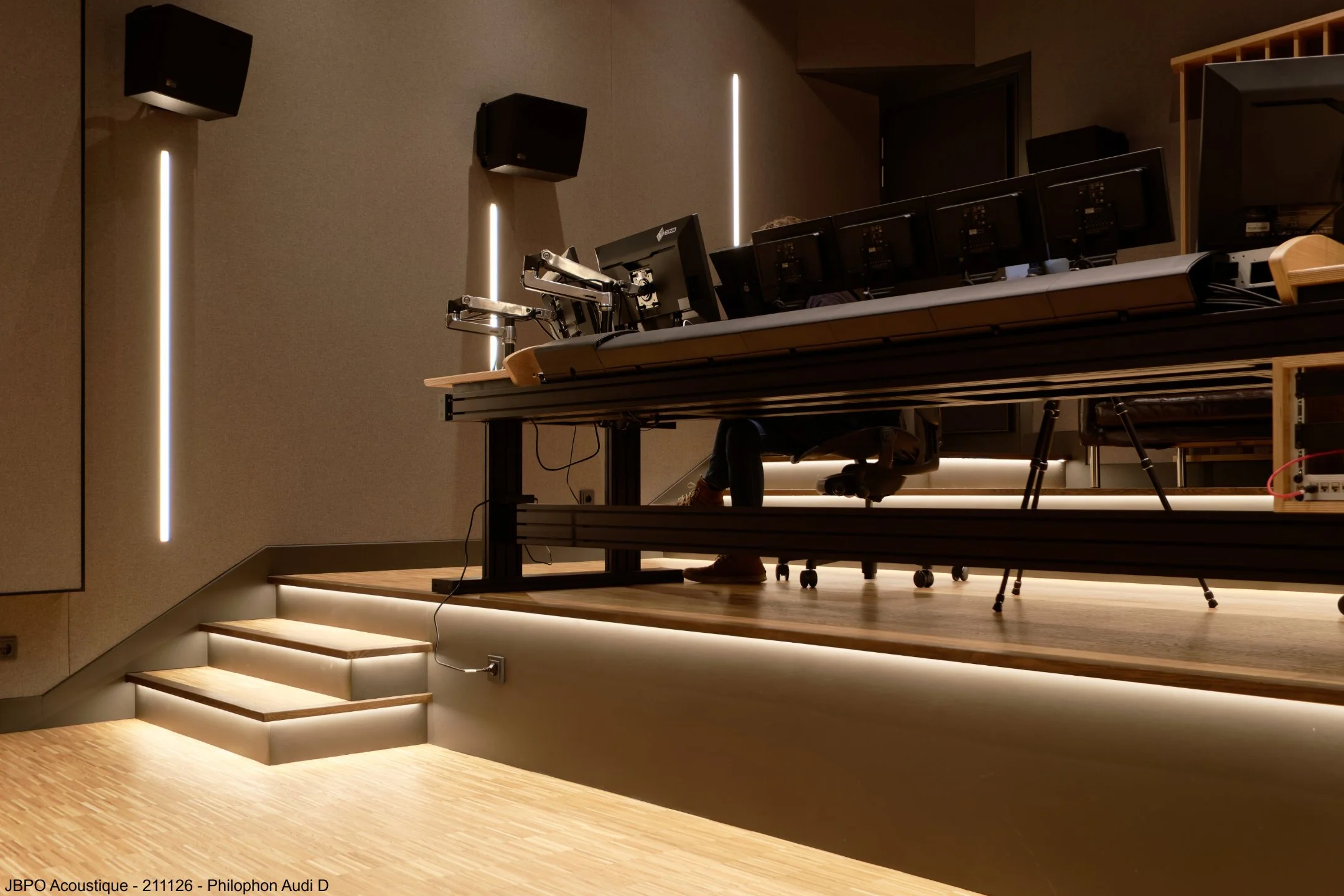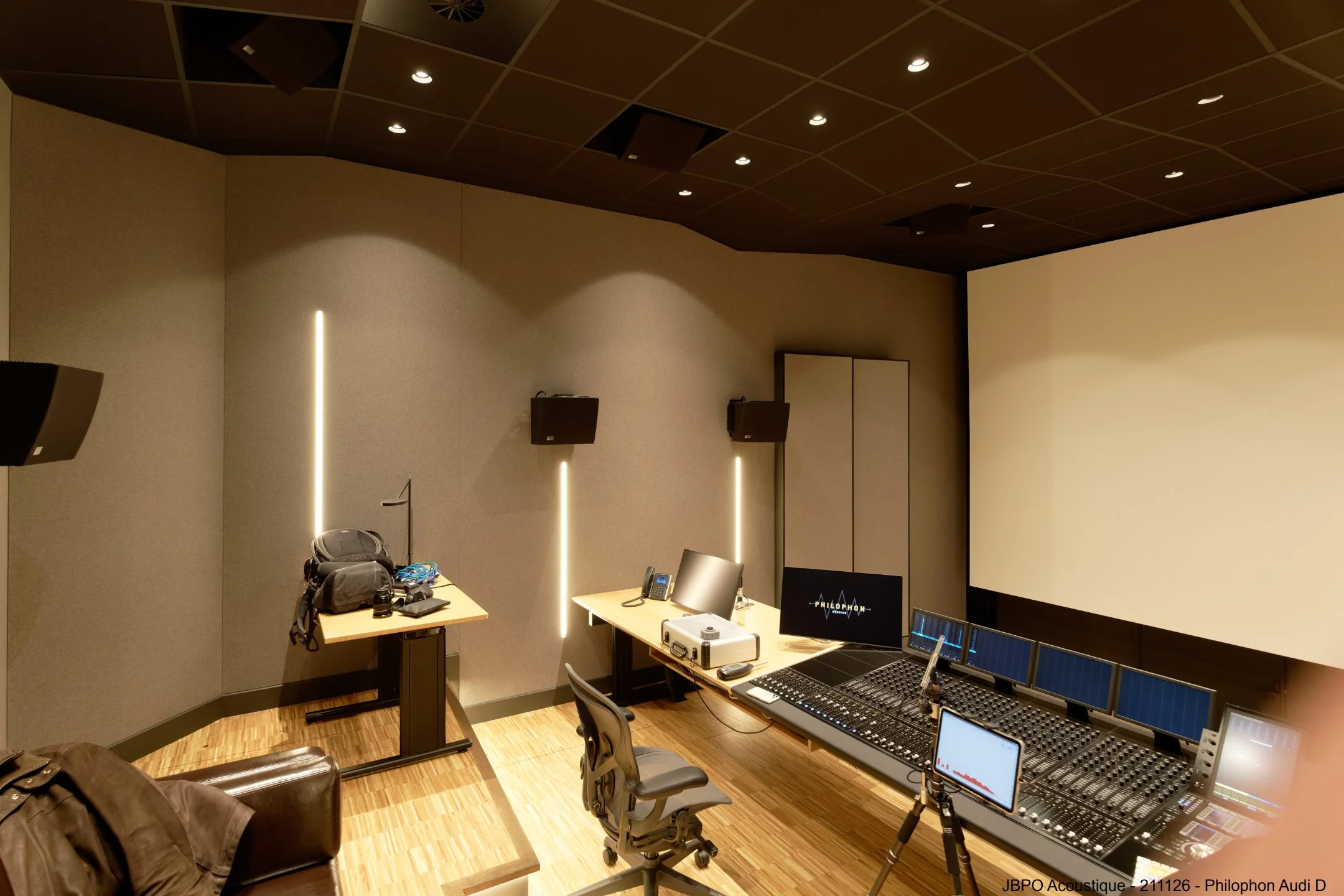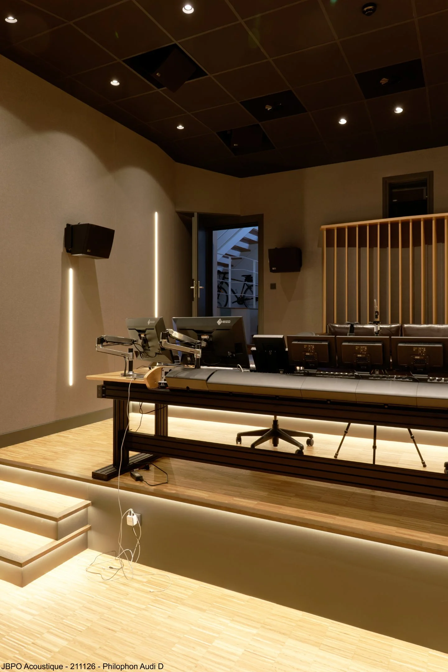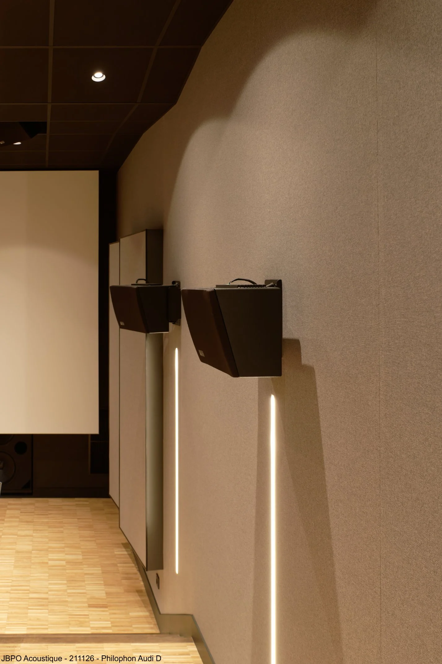 Cet auditorium de mixage Film Atmos possède une surface au sol d’une cinquantaine de m² pour une hauteur moyenne de 4,5 m. Monitoring Audio MEYER EXP.