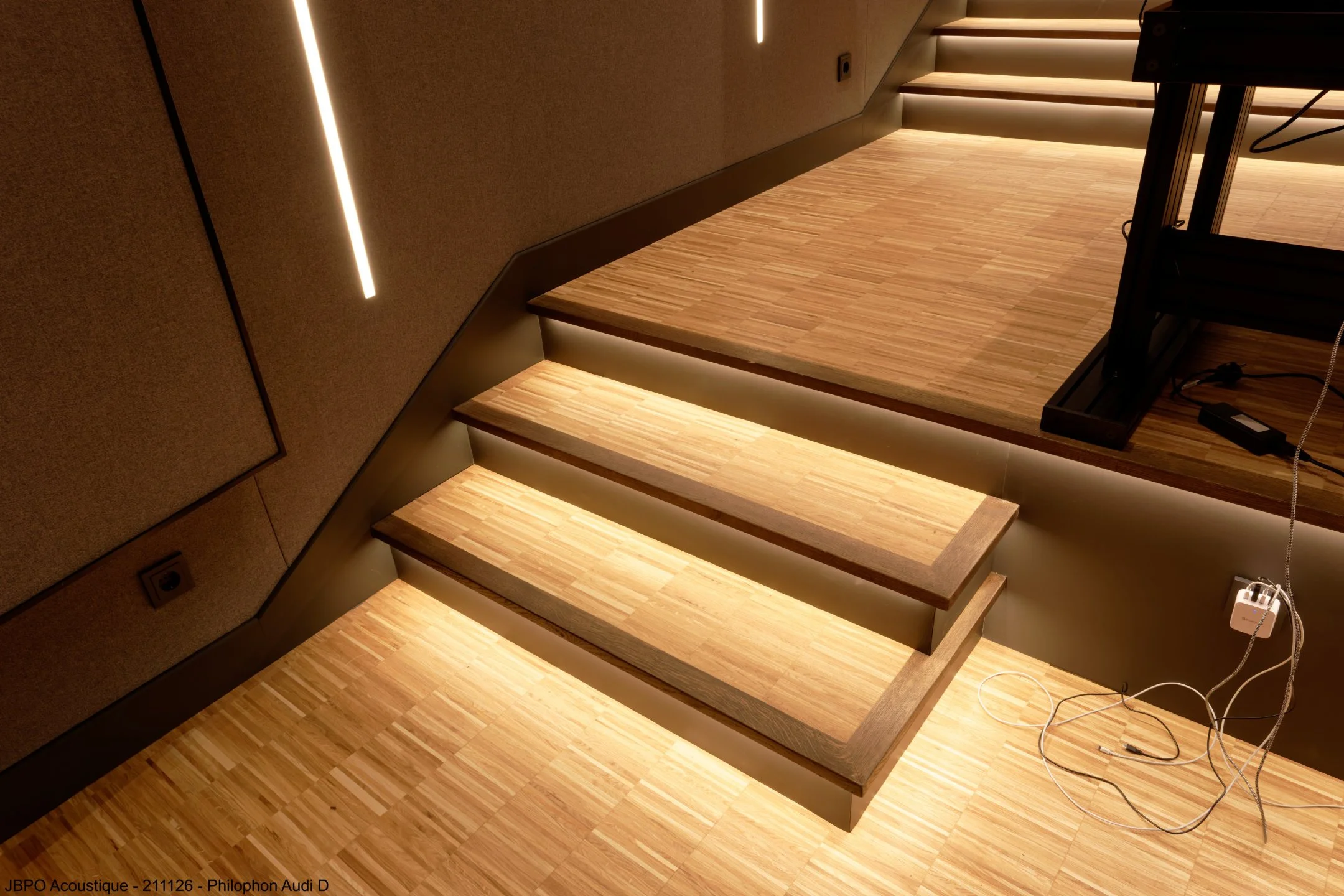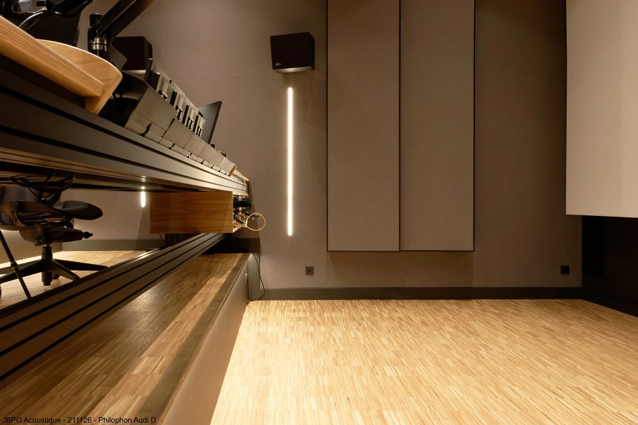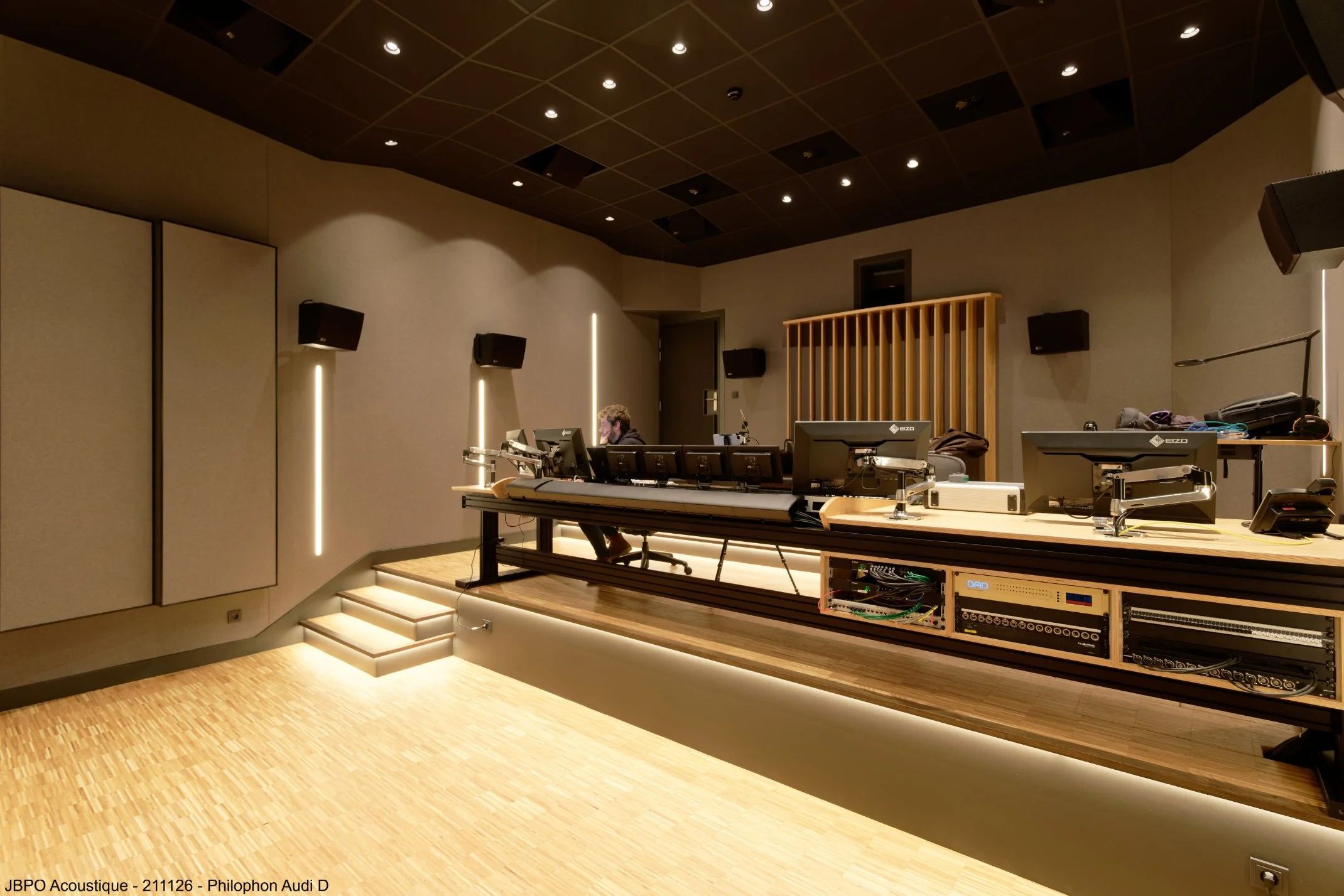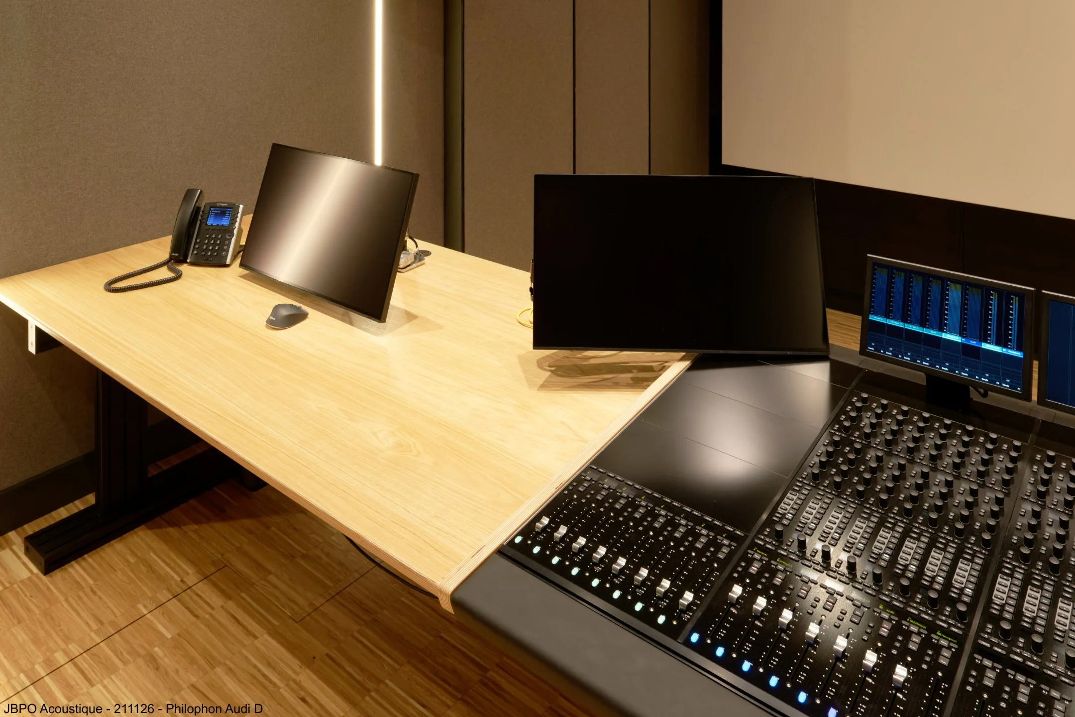 Cet auditorium de mixage Film Atmos possède une surface au sol d’une cinquantaine de m² pour une hauteur moyenne de 4,5 m. Monitoring Audio MEYER EXP.